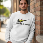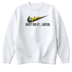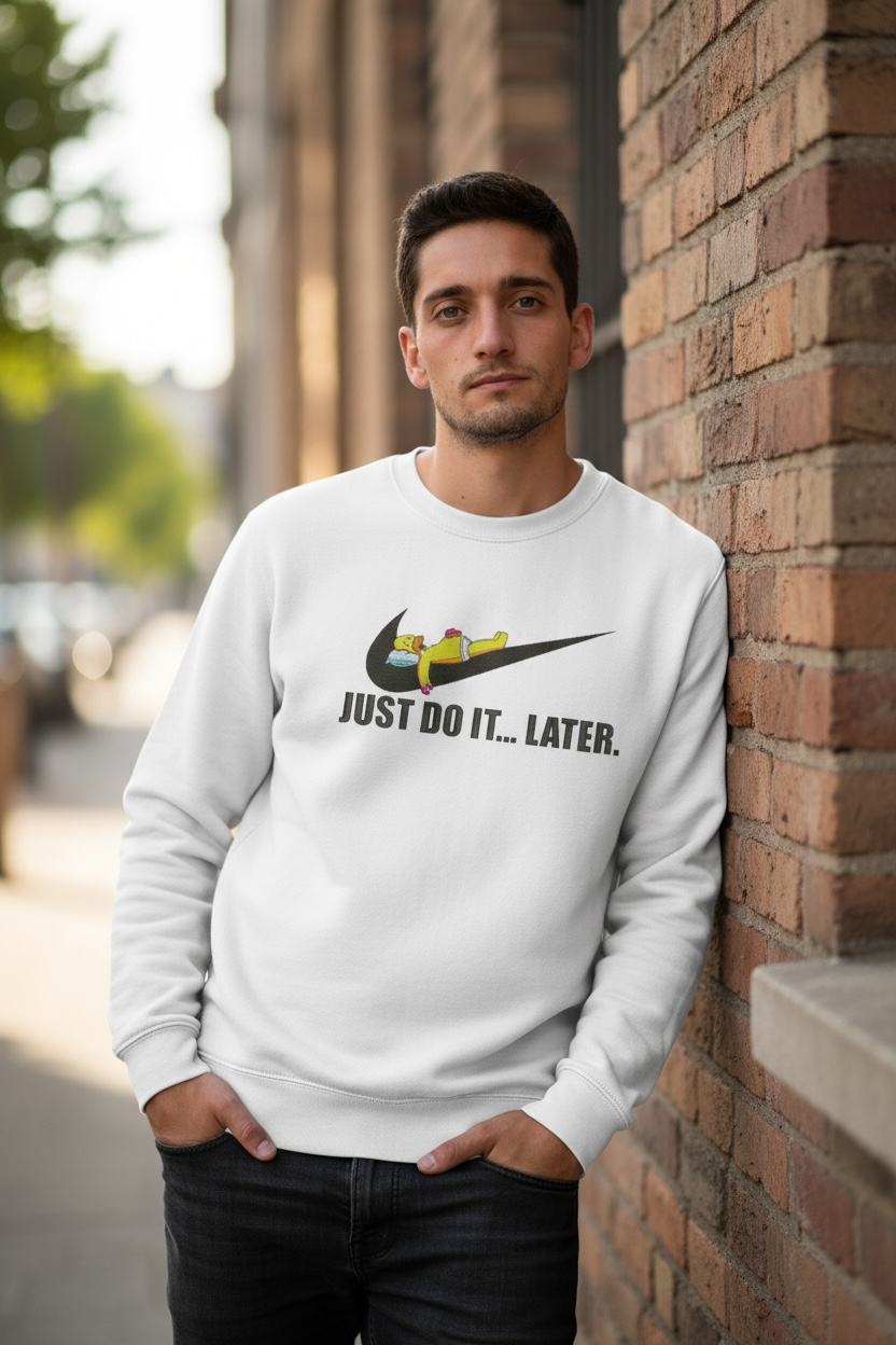 Felpa “JUST DO IT… LATER.” โ Il tuo manifesto contro la fretta Dimentica la pressione della produttivitร tossica e dei “devi farlo ora”. Questa felpa celebra la nobile arte di rimandare a domani quello che potresti fare dopodomani. Con la sua grafica che reinterpreta in chiave ironica il motto sportivo piรน famoso al mondo, รจ il capo perfetto per chi sa che le migliori idee arrivano… con calma.