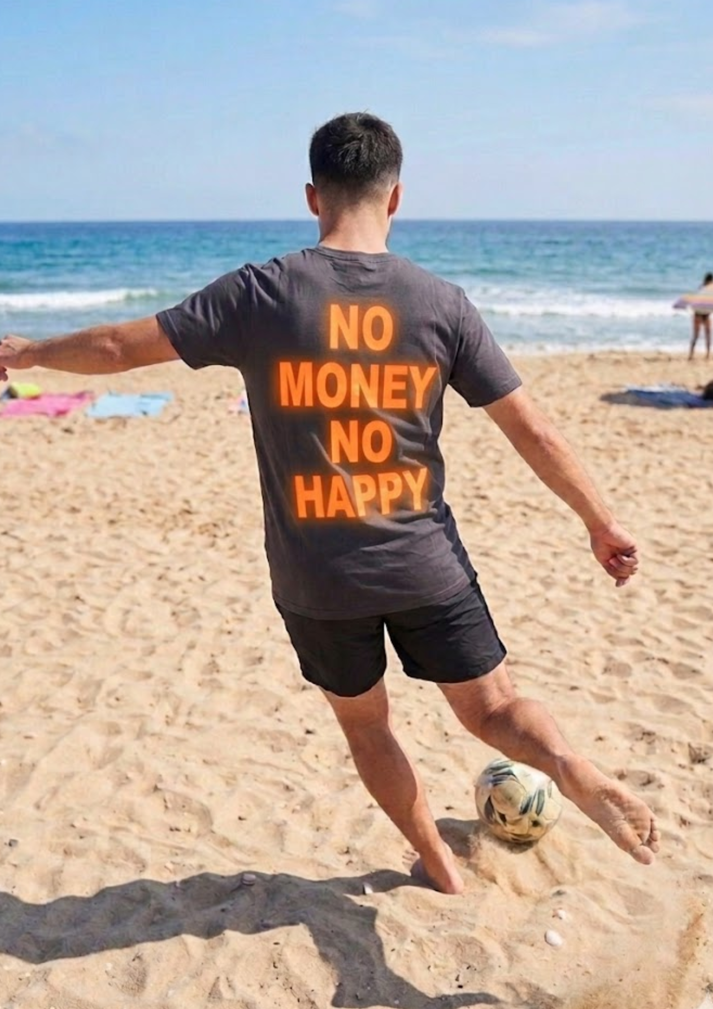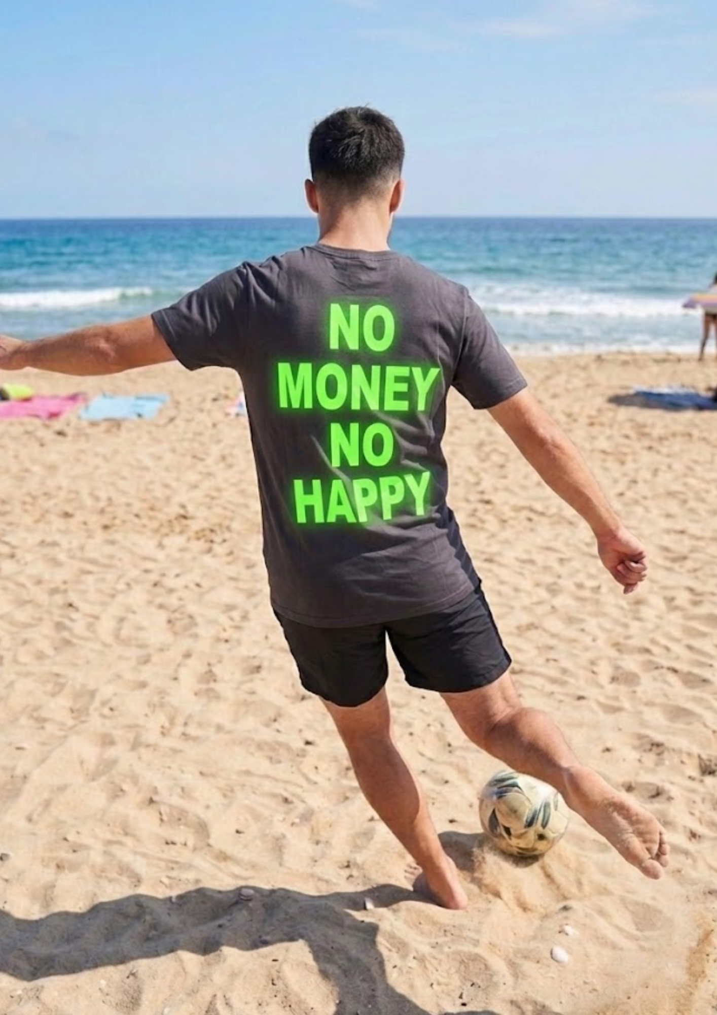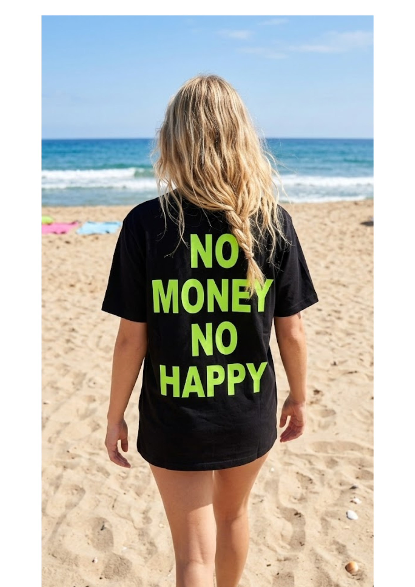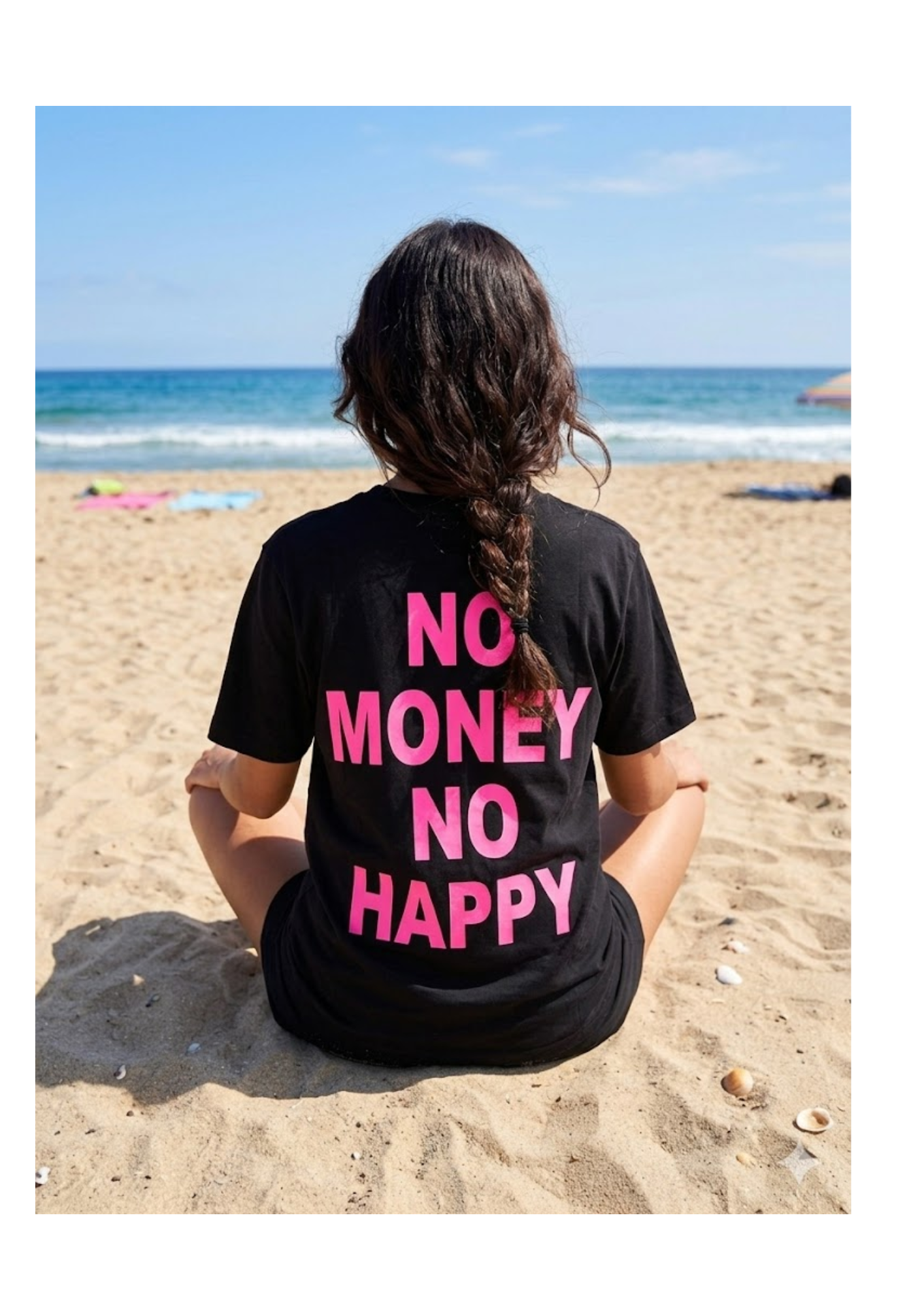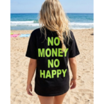 La T-shirt “No Money No Happy” non รจ solo un capo d’abbigliamento, ma una dichiarazione di stile pensata per chi vive la cittร  (o la spiaggia) con personalitร .